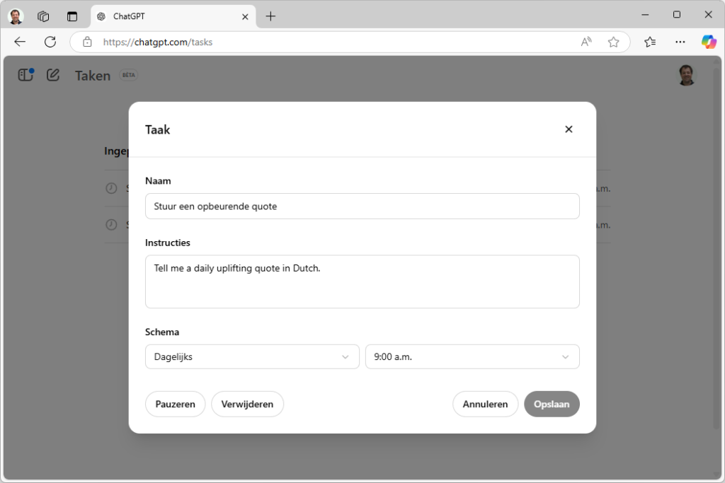 Als je via je profielafbeelding naar Taken gaat zie je alle taken die je hebt gemaakt. Je kunt taken bewerken, pauzeren of verwijderen.
